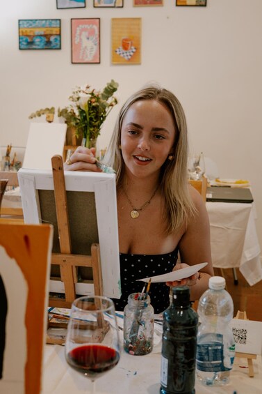 All the necessary materials (canvas, paint, brushes...) and wine