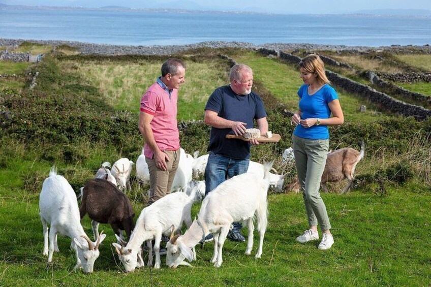 Aran Island Goat’s Cheese is a family run goat farm on Inish Mór – the largest of the Aran Islands - producing a range of soft cheeses and a barrel aged goats feta. The Island tour that also includes a stop at the cheese factory with people given the chance to meet the goats, watch cheese being made, have an educational commentary and taste the cheese. Aran Goats Cheese produces a soft cheese with or without Dillisk (a seaweed harvested on the island), a Gouda which also comes infused with sea lettuce, or Dillisk, a medium hard cheese that looks like Brie and a Summer Cheese not unlike Feta. Their Dillisk is harvested on the shores of Inis Mór. The pigs on the farm are also fed whey, a by product of cheese making, so nothing goes to waste.