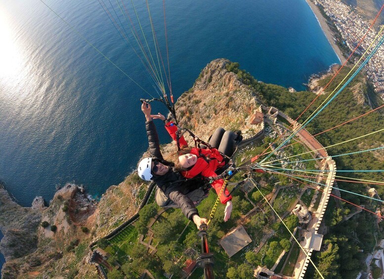 Our guests, who are taken from the hotels in Side region between 08:30 and 09:30 in the morning, reach Alanya Cleopatra Beach after about an hour's journey. After distributing the insurance cards of our instructors and giving the necessary information, we set off to the starting point with our vehicles and equipment. Passing through the banana fields, we reach the hill at an altitude of 500 metres. Here, too, we put on our equipment after the instructors give us the information we need to do during the flight before the flight. If we are amateurs, we start flying with a professional instructor, if we are professionals, we start flying on our own. Our flight with a view of the magnificent Alanya Castle, the peninsula, the city of Alanya and the Mediterranean Taurus Mountains takes about 15 minutes. Depending on the wind, we can go up to 2000 metres during the flight. We end our adrenaline-filled flight at Cleopatra Beach. After watching our photos and videos taken during the flight at our agency's office on the beach, they can optionally purchase them. Then we have free time. If you wish, you can swim, sunbathe, and dine in the restaurant at Cleopatra Beach with its unique sandy beach and clean water during this free time. You can spend your time in Alanya, which is a unique city with its history and culture. Around 16:30-17:00, we arrive at the meeting place indicated by our guide and return to our hotel by bus. We arrive at our hotels around 17:30-18:00.