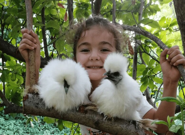 This is a guided walk through a family-run farm where rescued animals live peacefully in open spaces, and nature grows wild and honest. Here, you’ll meet curious goats, gentle ponies, proud peacocks, clucking hens, rabbits, pigs, cows, and even shy deer or foxes that sometimes choose to appear. Many of these animals carry a past: stories of abandonment, illness, or mistreatment. This experience gives you the rare opportunity to not just see them—but to touch, connect, and understand.