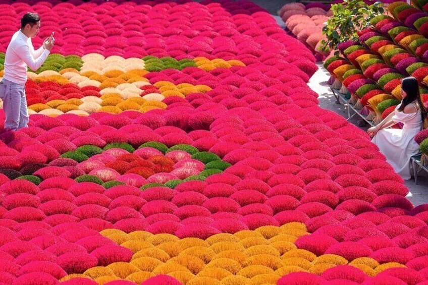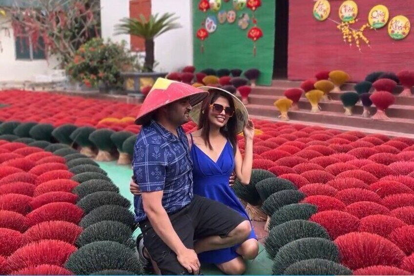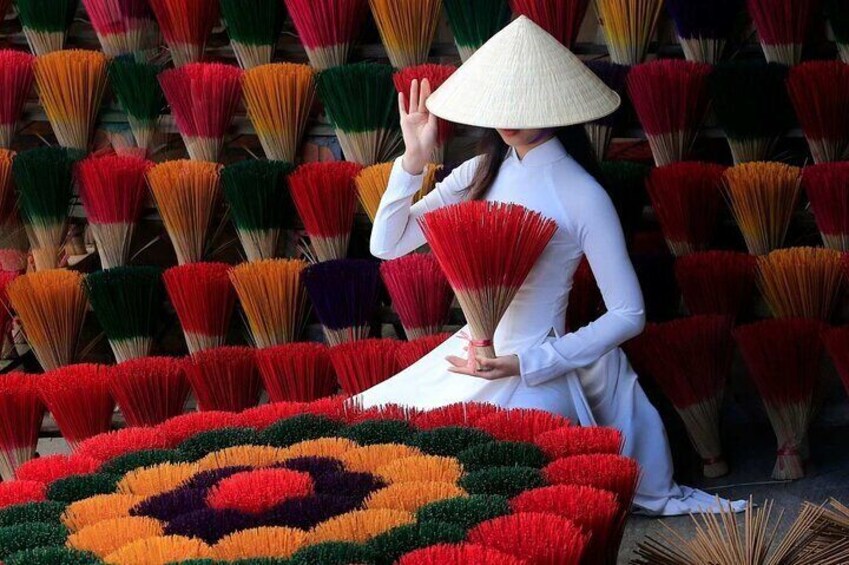 The first stop is Quang Phu Cau Village, a traditional craft village on the outskirts of Hanoi, renowned for its hand-made incense sticks. Passed down through generations, this craft comes alive especially during Lunar New Year, when thousands of colourful incense sticks are laid out to dry, creating a vibrant and photogenic scene. Visitors can admire the bright red and pink hues and watch skilled artisans at work, preserving this unique cultural tradition.