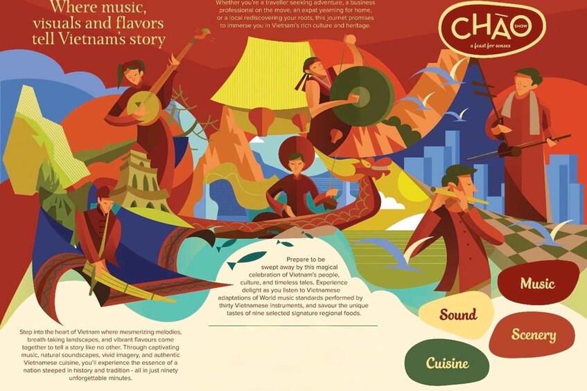 Immerse yourself in an unforgettable evening of Vietnamese culture at the Chào Show in Ho Chi Minh City. This unique performance blends live folk music, immersive visuals, and fine dining into one multi-sensory journey.