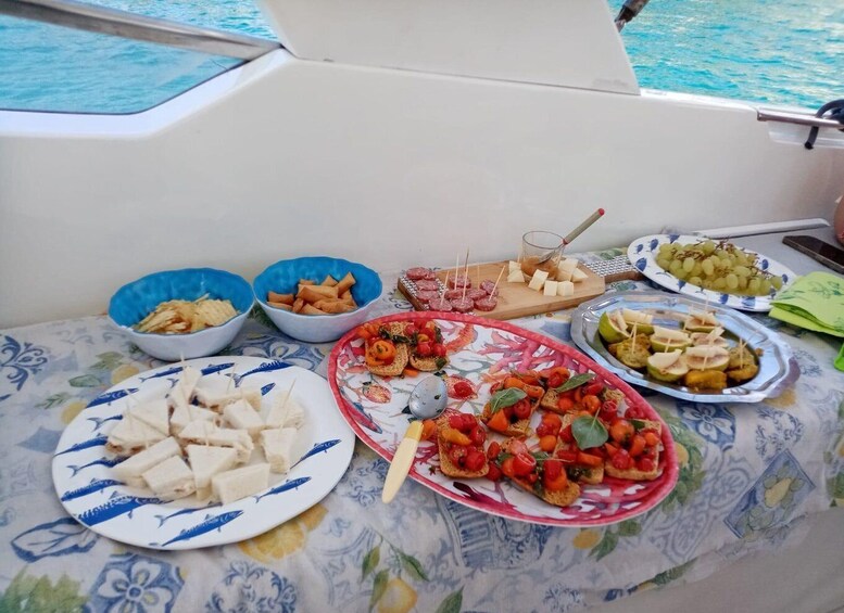 During the tour, there will be several stops for swimming in the crystal-clear waters, which are accessible only by boat. On board, you will find everything you need for your comfort: towels, beach cushions, masks, and inflatable mats. A delicious aperitif featuring seasonal produce and chilled water will make the experience even more enjoyable.