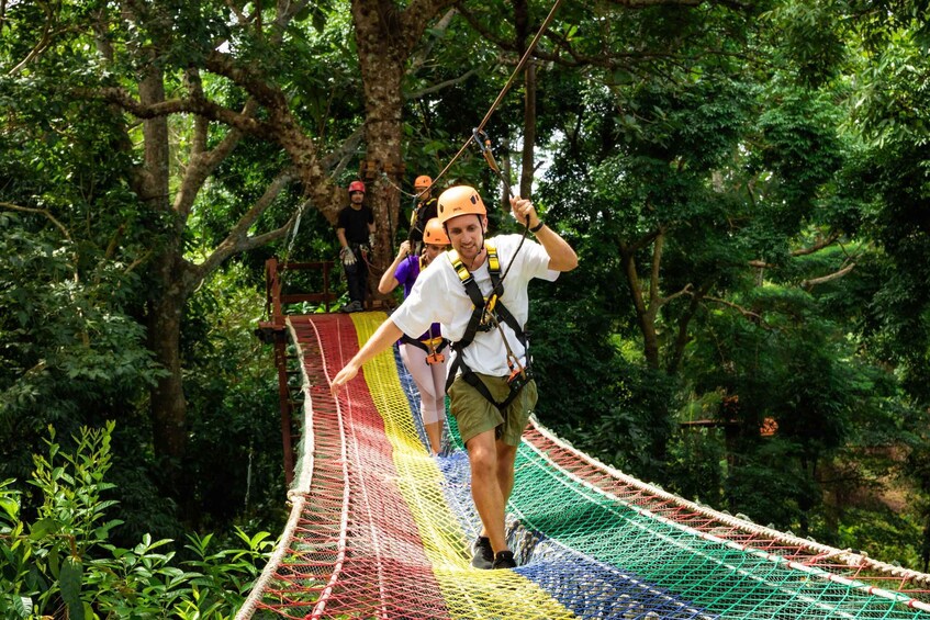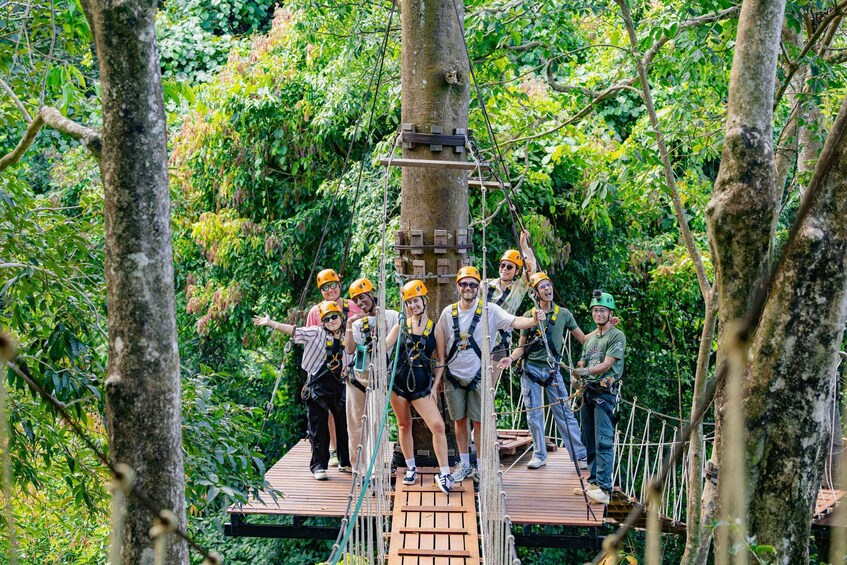 The best balance: 2 ziplines, sky bridge, 30 m abseil, dual zipline, spiral staircases, rainbow bridge, sky wall, bamboo tower. Return transfer included.