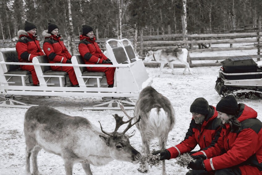 After spending time with the reindeer, the sleigh ride continues through snowy terrain back towards Aurora River Camp. The return journey offers more beautiful scenery and a final chance to breathe the crisp Arctic air. The entire activity is gentle and suitable for all ages, making it an ideal choice for families, couples and travellers who want to experience the beauty of Lapland without needing to drive a snowmobile.