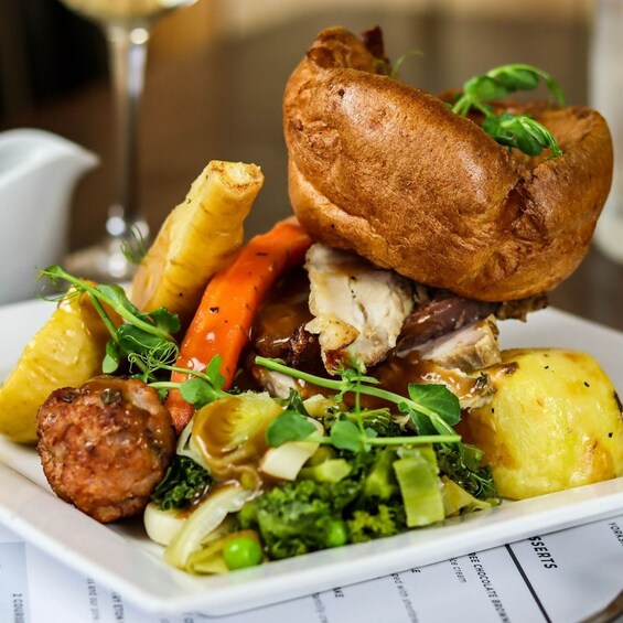 Hop aboard the Alfie Bhoy narrowboat for a cruise through the Lancashire waterways. Savour a succulent roast dinner with your choice of meat or vegan dishes, alcoholic drinks, and traditional English side dishes.