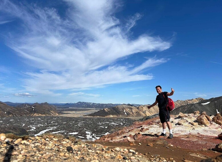 Only a few minutes away is one of the most picturesque stops, Landmannalaugar. This area is one of Iceland’s secret gems with its colourful rhyolite mountains and its geothermal swimming pool bordered by steep black lava fields.
