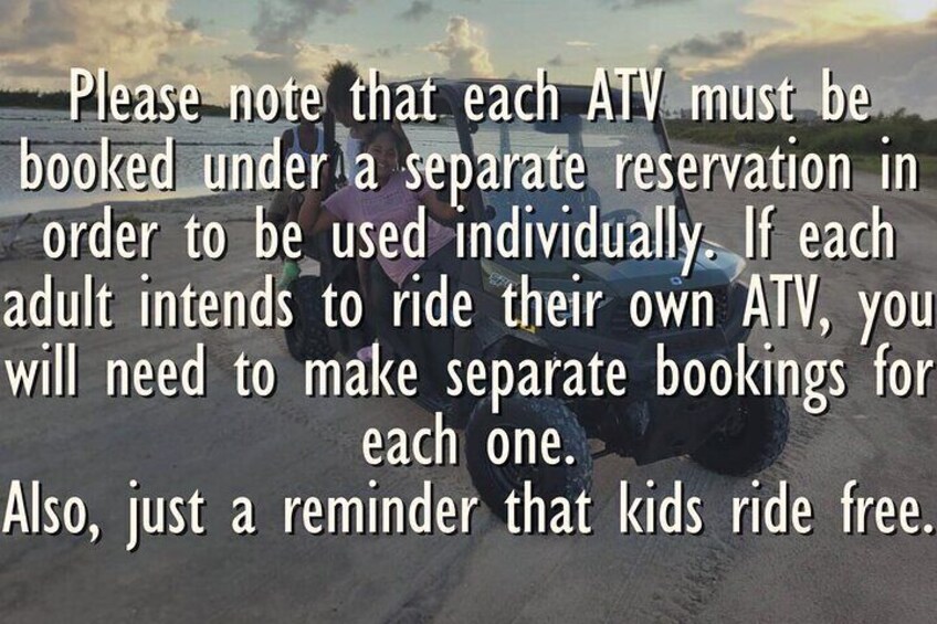 - Each reservation is for one quad bike only. If you need multiple ATVs, please book a separate reservation for each.