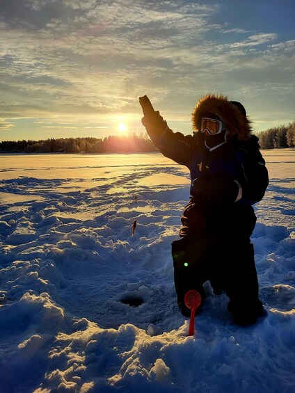 We’ll head north from Levi to a small local village, where nature feels untouched and time slows down. After a short walk across the sparkling snow, we arrive at a frozen lake nestled among the wintry trees – a picture-perfect place for ice-fishing.