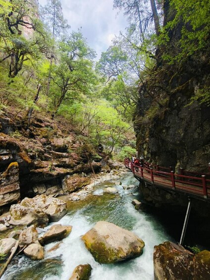 After a photo stop, begin a hike along the high road, offering panoramic views of the gorge. Walk along a narrow path on the mountainside, passing small waterfalls along the way. Reach Zhang's Guesthouse for lunch before heading to Baishuitai, known as the “Fairy Terraces.” Explore the unique white stone terraces, resembling frozen waterfalls in the sunlight.