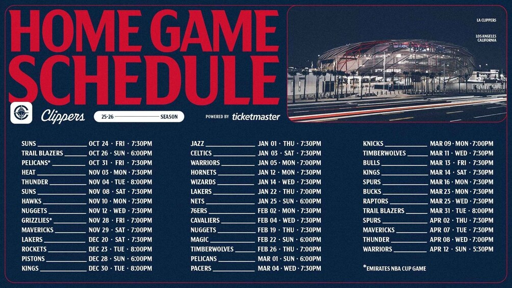 Arrive early to soak up the pre-game buzz, grab a classic stadium snack, and find your seat among the sea of red, white, and blue. Watch as the Clippers face off against rivals like the Lakers, Celtics, Warriors, and more. From the opening tip-off to the final buzzer, enjoy fast-paced action, slam dunks, and unforgettable moments on the court. The arena’s giant screens, lively music, and crowd chants make every minute exciting, whether you’re a lifelong basketball fan or a first-time visitor.