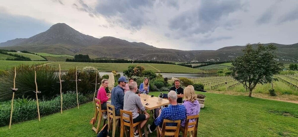 You will be welcomed with a MCC (South African Champaign) tasting and experience a full cellar tour of a working winery as well as an MCC cellar. We sit down to enjoy a selection of local artisan cheeses and start our first Wine tasting under the canopy of huge oak trees in the scenic courtyard while you learn in traditional wine etiquette.
