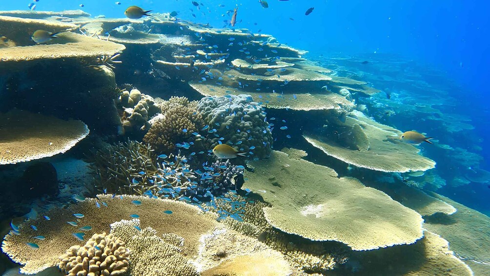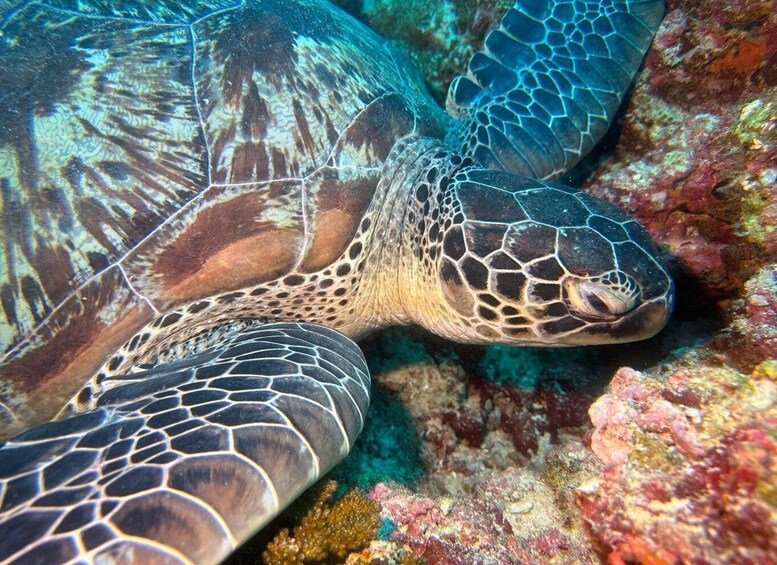 Head to the turtle reef where you can put on the snorkelling gear again to spot turtles eating, resting, or coming to the surface to catch a breath. Get your picture taken by your guide while swimming with the turtles