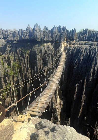 Explore the Tsingy de Bemaraha National Park, a UNESCO World Heritage Site known for its unique karst formations. Begin with the Great Tsingy, navigating a labyrinth of limestone peaks and crossing a hanging bridge. In the afternoon, visit the Little Tsingy.