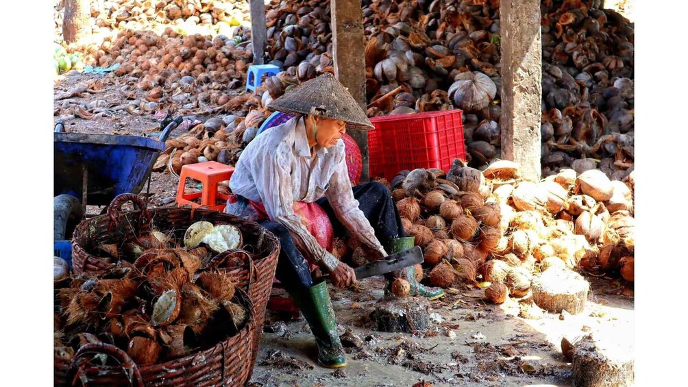 The trip starts with a fragrant cup of coffee and a delicious Vietnamese breakfast. When you arrive in Trà Vinh, you’ll wear a traditional áo bà ba and experience life like a local. You’ll pick fresh coconuts, learn how to husk and chop them, and enjoy the sweet taste right in the cool, green orchard. There’s nothing more relaxing than lying in a hammock, sipping fresh coconut water, and listening to the sound of birds singing.