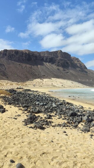 The area around the volcano is characterised by dark, rocky terrain with little vegetation, creating a desert-like and almost lunar landscape. The rhythmic sound of waves gently crashing on the sand serves as a natural soundtrack. The fresh, salty sea breeze touches your face, bringing a feeling of freedom and tranquility.