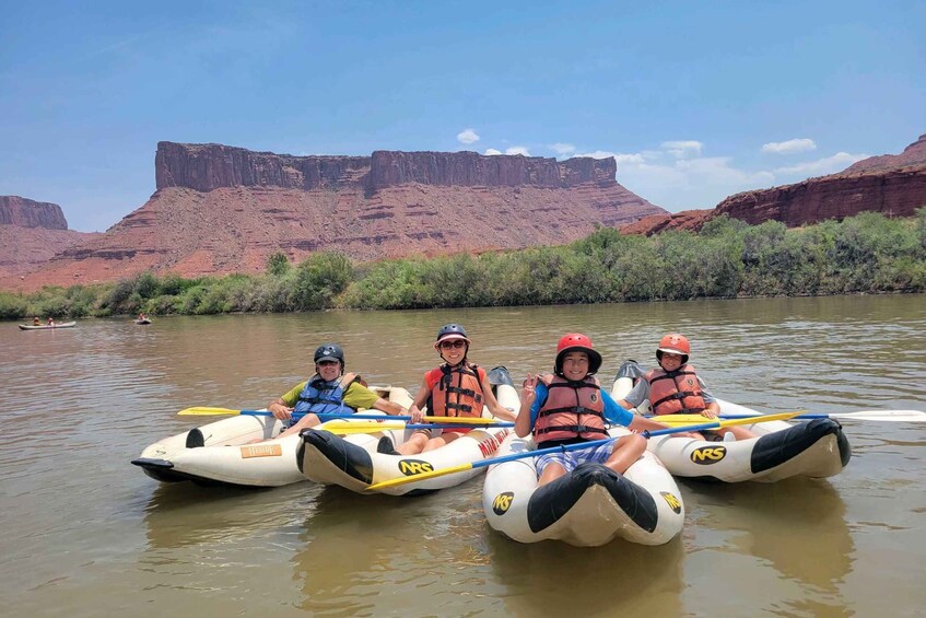 This paddling trip offers a quick teaser of the scenic beauty and easy rapids of Castle Valley! Our half-day trips give you about 2 hours on the water to take in the incredible beauty of this sandstone paradise. Meet at the Mild to Wild office to check in and get ready for the river! Your guides will get you fitted for a PFD (aka life jacket) and then hop on the shuttle for a scenic 40 minute drive out to Castle Valley. Once there, we’ll have a safety orientation and some paddling instruction before you push off with the fleet for the next couple hours. Kayaking trips float with the rafting trips, and the guides will give you instruction as you paddle along. The kayaks move much faster than the rafts, so on occasion you may have to wait up for them. More time to take in the scenery, we say! This is a very mild rafting trip, with mostly calm flat water with a couple rapid sections sprinkled in along the way. Once we've reached the take out, we’ll take out and shuttle back to the office for the end of your trip.