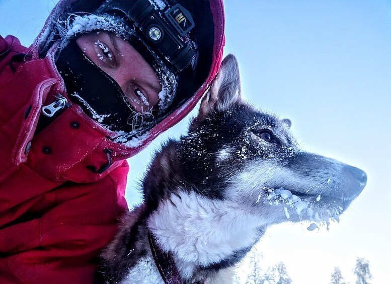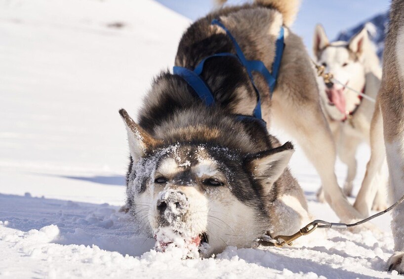 Begin your adventure by meeting your guide at the huskyfarm and getting kitted out with warm winter clothing. Head to the tour start point in the valley and meet the huskies. Set off on a thrilling dog sledding tour through peaceful, snow-covered forests, along a crystal-clear river, and at the foot of majestic mountains. Feel the power of the dogs as they pull you through the stunning landscapes. Be a passenger on a big sleigh pulled by 12 amazing dog, learn about the nordic sleddogs and the bond between the pack. We stop halfway, where you can get off the sleigh and meet the dogs, take pictures, give snacks for the dogs, and even lie down in the meter-deep snow.