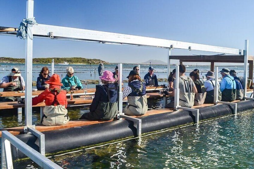 Climb into waders (supplied), and hear from the Oyster Farmer himself who will first take you on a historical adventure explaining Matthew Flinders voyage.  Wade out into the water to our floating pontoon where you will learn about how oysters are farmed, and taste the freshest oysters you'll ever taste, straight out of the water.  You'll have a chance to taste Pacific Oysters and the Native Coffin Bay Angasi Oyster.  You'll also have a hands-on shucking lesson where you will learn to shuck your very own oyster.  You'll have the chance to ask lots of questions, and by the time you leave you'll be an oyster officionardo!