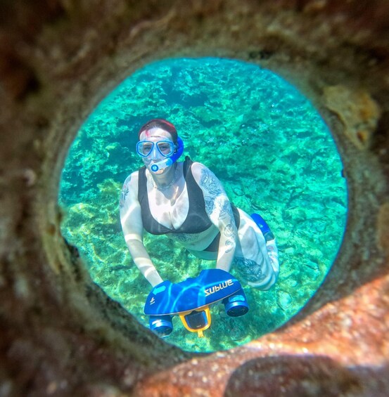 • Use a sea scooter provided to glide effortlessly through the clear waters