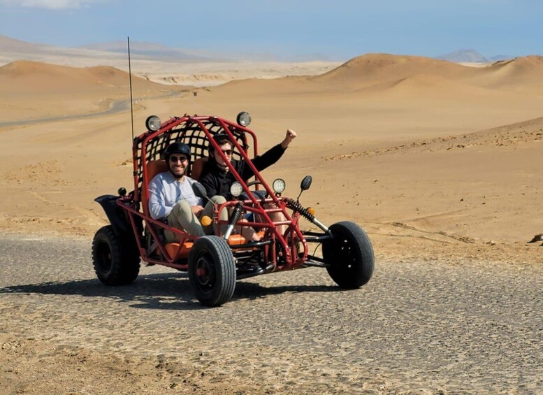 Then, swap the sea for the desert and get your adrenaline pumping with a thrilling mini buggy ride through the Paracas National Reserve. Cross the impressive Paracas Desert and explore iconic places like Yumaque Beach, the Isthmus, and the unparalleled Red Beach, while enjoying spectacular coastal landscapes and unique natural formations.
