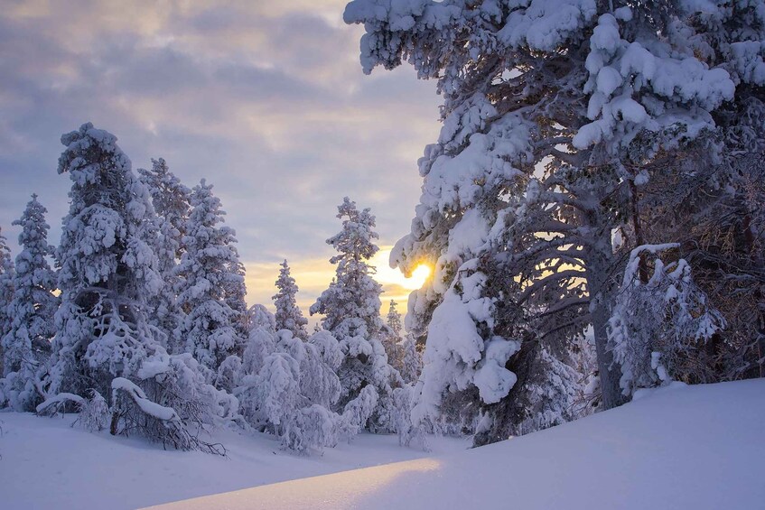 This tour takes you to a quiet snowy forest near Rovaniemi.