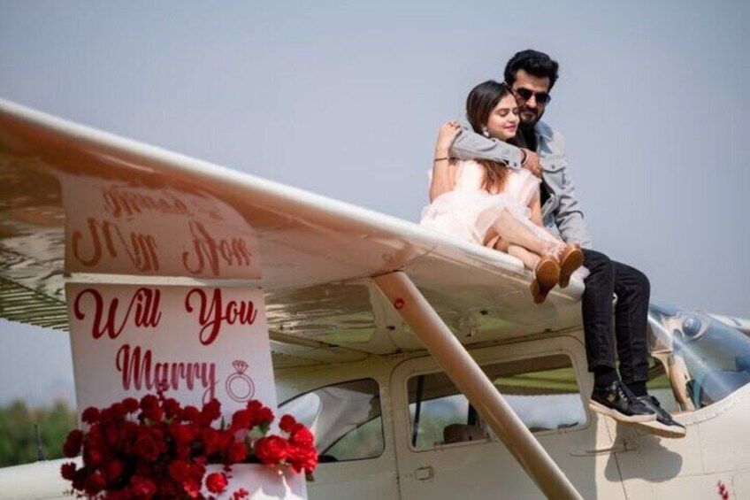 From start to finish, the experience is pure romance. You’ll be welcomed with fresh flowers and elegant decor at the airfield, and after landing, celebrate your engagement with a toast of bubbly or juice. Capture stunning photos inside the cabin, on the wings, and beside the proposal sign.