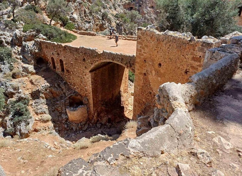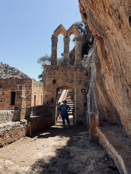 Nearby, you can explore the impressive Katholiko Gorge, known for its dramatic cliffs and serene environment. Located slightly inland from the shore, the monastery is one of the oldest in Crete, dating back to the 11th century. The monastery, now in ruins, offers a glimpse into the island's rich monastic history. You'll find the iconic arched bridge leading to the monastery and a cave that was historically used as a hermit’s dwelling, adding to the mystical allure of the location.
