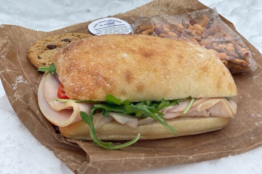 - Please leave your sandwich choice in the Special Requirements Box.Choice of sandwich: turkey, ham, roast beef, or veggie. Choice of drink: coffee, tea, hot cocoa (water included for everyone). Other snack choices like chips, cookies, and crackers are provided.