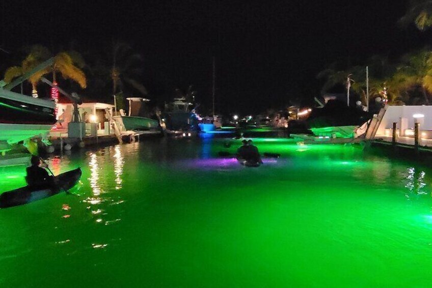 Kayakers will board their kayaks just prior to sunset, departing the marina towards the ocean just as the sun begins to create gradients of pink and orange in the sky. As you turn north into Tavernier Creek, you will definitely spot some of the Florida Key's stunning wildlife. You may even glide past a grazing manatee. After some paddling, you'll find yourself near the entrance of a thick mangrove forest; your tour guide will help you navigate through a narrow channel in the trees, highlighting various features of the natural ecosystem as you continue. Once dark enough, your tour guide will equip your kayak with a battery-powered LED light that illuminates the water below you. The light is typically green, enabling the greatest visibility for you while minimising any input on marine life. Embrace the surreal experience as you continue to navigate the calm waters with the magical light glowing all around you. As you return to the marina, you'll also enjoy multi-colored lights in the man-made canal, turning your kayak tour into a dazzling night-parade.