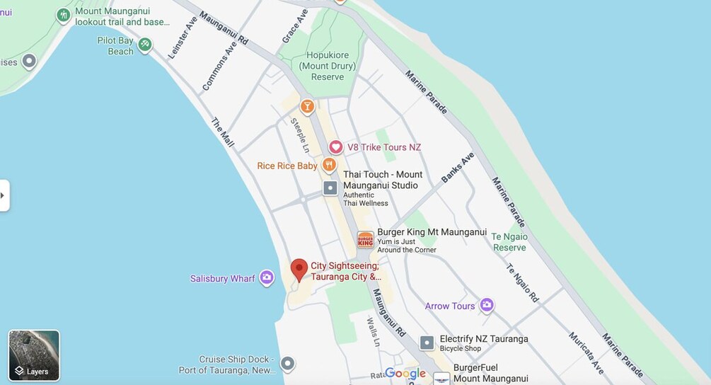 - Salisbury Avenue, Mount Maunganui 3116, New Zealand | Meeting Point When you exit the port gates, turn RIGHT and walk about 20 metres. You'll spot a RED flag and our advertising boards on the grass. Please wait there as a member of our staff will be looking out for you. If you have trouble finding the location, please return to the Information Centre inside the port gates near the exit. Our team at the RED "City & Scenic Sightseeing" desk will be happy to assist you.
