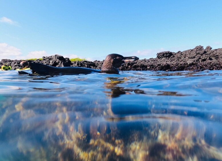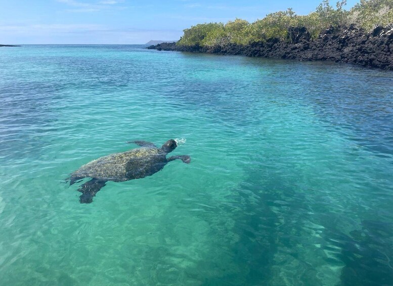 First you will start with a boat ride around the bay to observe volcanic formations, pelican nesting site, marine iguanas swimming, sea turtles on the water, Galapagos penguins swimming or resting on their natural habitat, blue footed boobies fishing and/or resting.