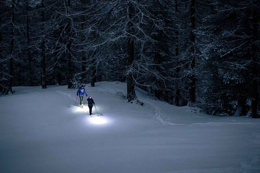 The trip begins with a meetup at Claviere's church square in the afternoon. The necessary equipment (snowshoes, poles and headlamp) will be given to you here.