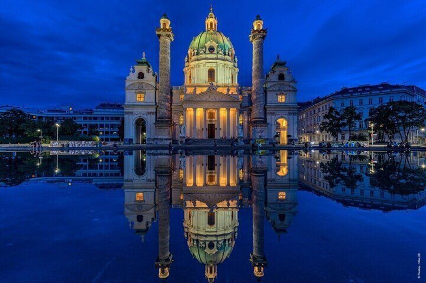 You're looking at a real picture. The Church of St. Charles of Vienna stands behind the fountain, a beautiful emblematic image of Vienna. You donāt need to love churches to admit that it is really beautiful with its dome and twisted columns.