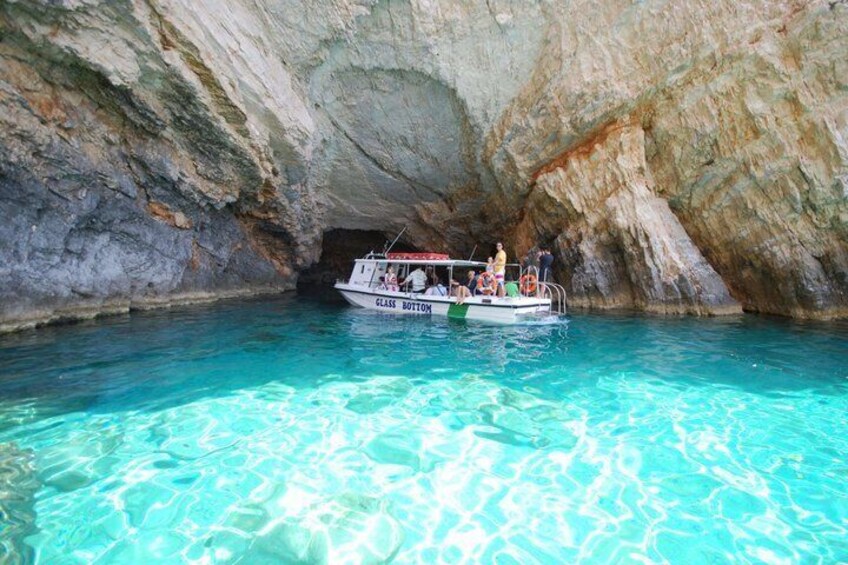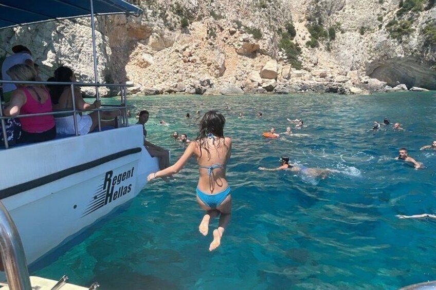 Zakynthos Sunset Cruise to Mizithres with Swimming Stops & Wine